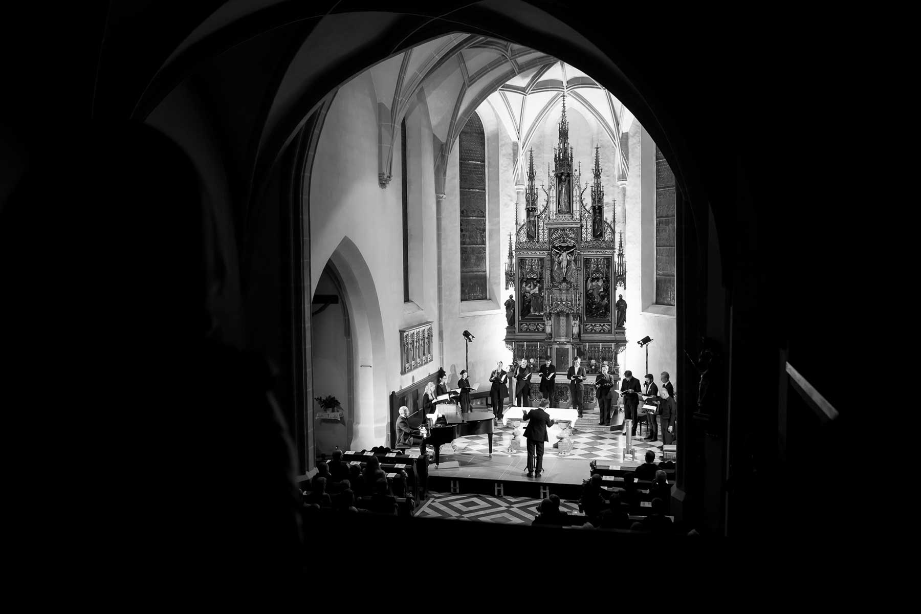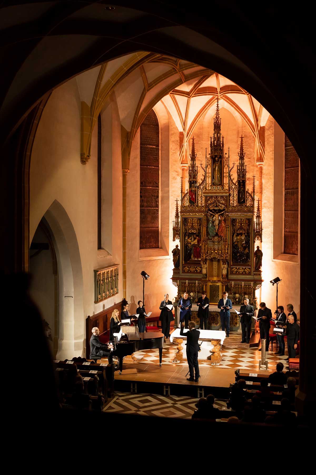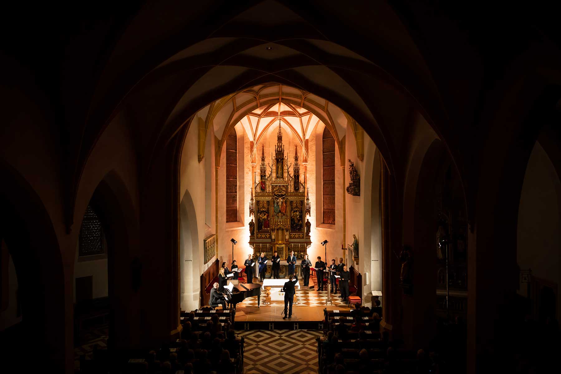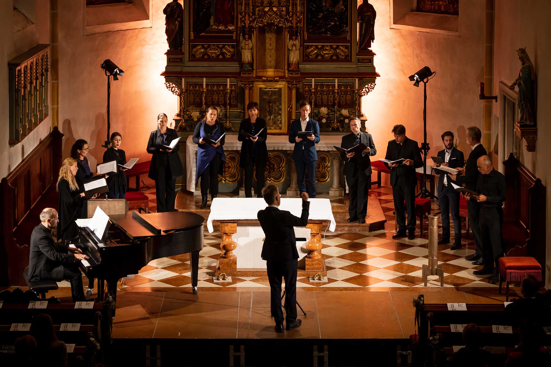 Die Stimmen dieses Chores, mal nur wenige, mal alle zusammen, von hoch bis tief, von laut bis leise, bildeten eine so außergewöhnliche Symbiose, dass einem die Musik von Schubert und Mahler wie aus einer anderen Welt erschien. Die berühmten Chorwerke Franz Schuberts – in einzigartiger Perfektion vorgetragen. Gustav Mahlers Rückert-Lieder in einer Bearbeitung für 12 Stimmen a capella geschrieben von Lukas Haselböck – zum Weinen schön. Die Klavierimprovisationen des ausgezeichneten Pianisten György Handl, die sich dazwischen einwebten – beeindruckend und bezaubernd. Die hochkonzentrierte Stille in der gut gefüllten Pfarrkirche während des gesamten Konzertes, der ausgelassene, tosende Applaus am Ende – Gänsehaut pur und der gebührende Dank an die Künstler*innen auf der Bühne.