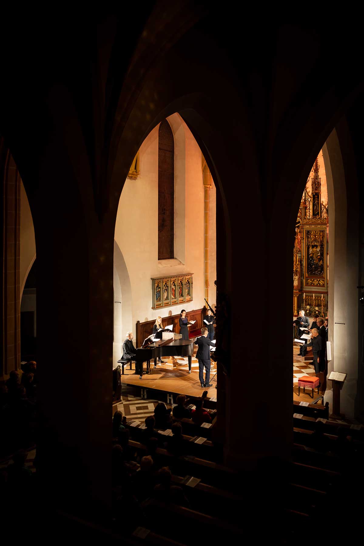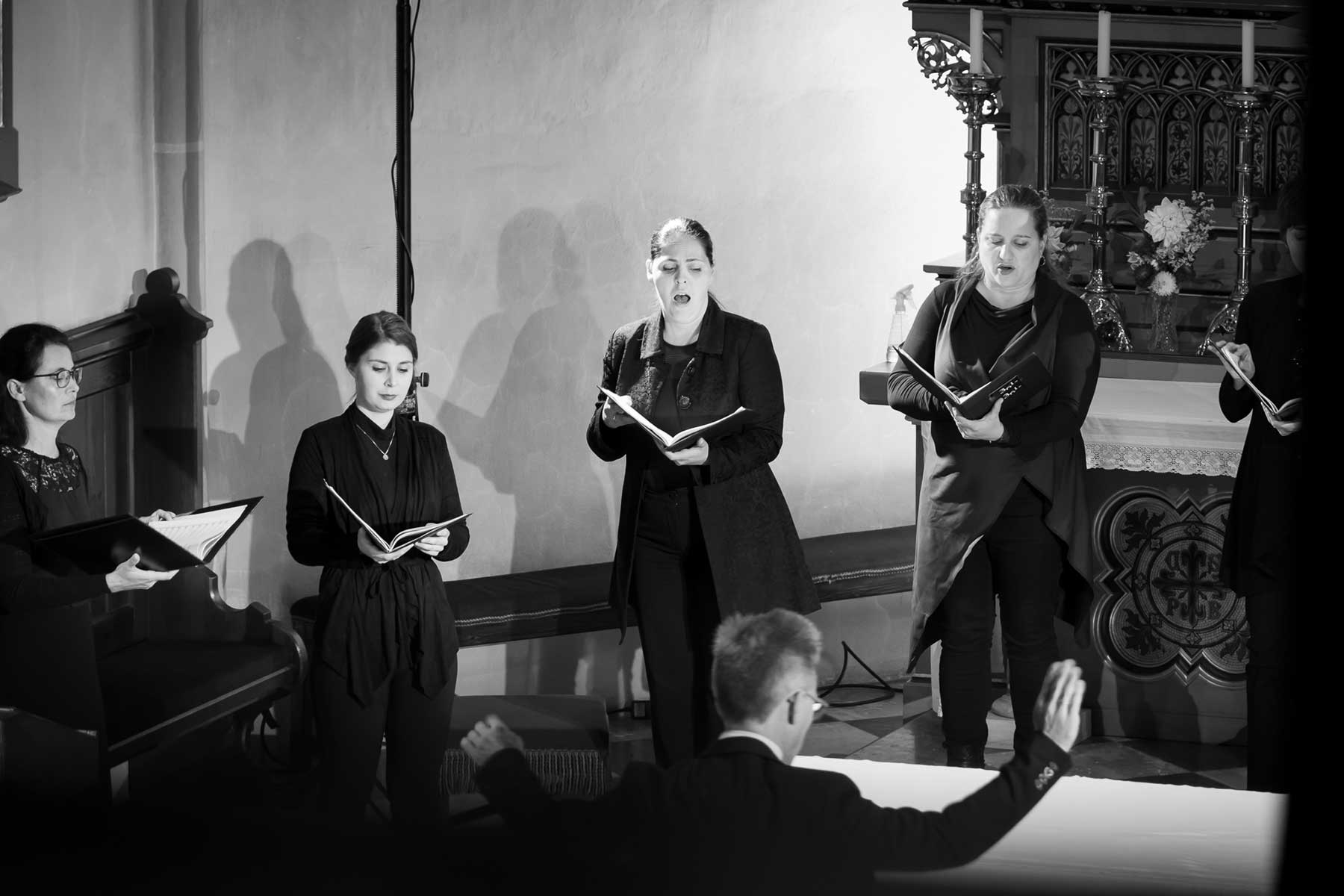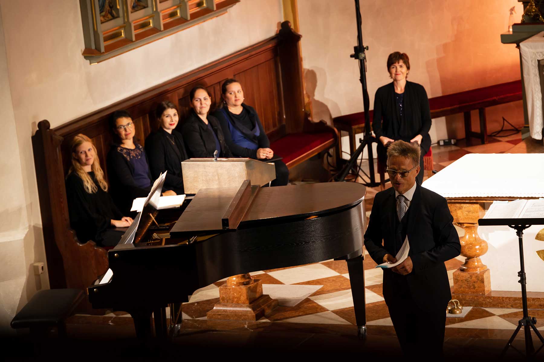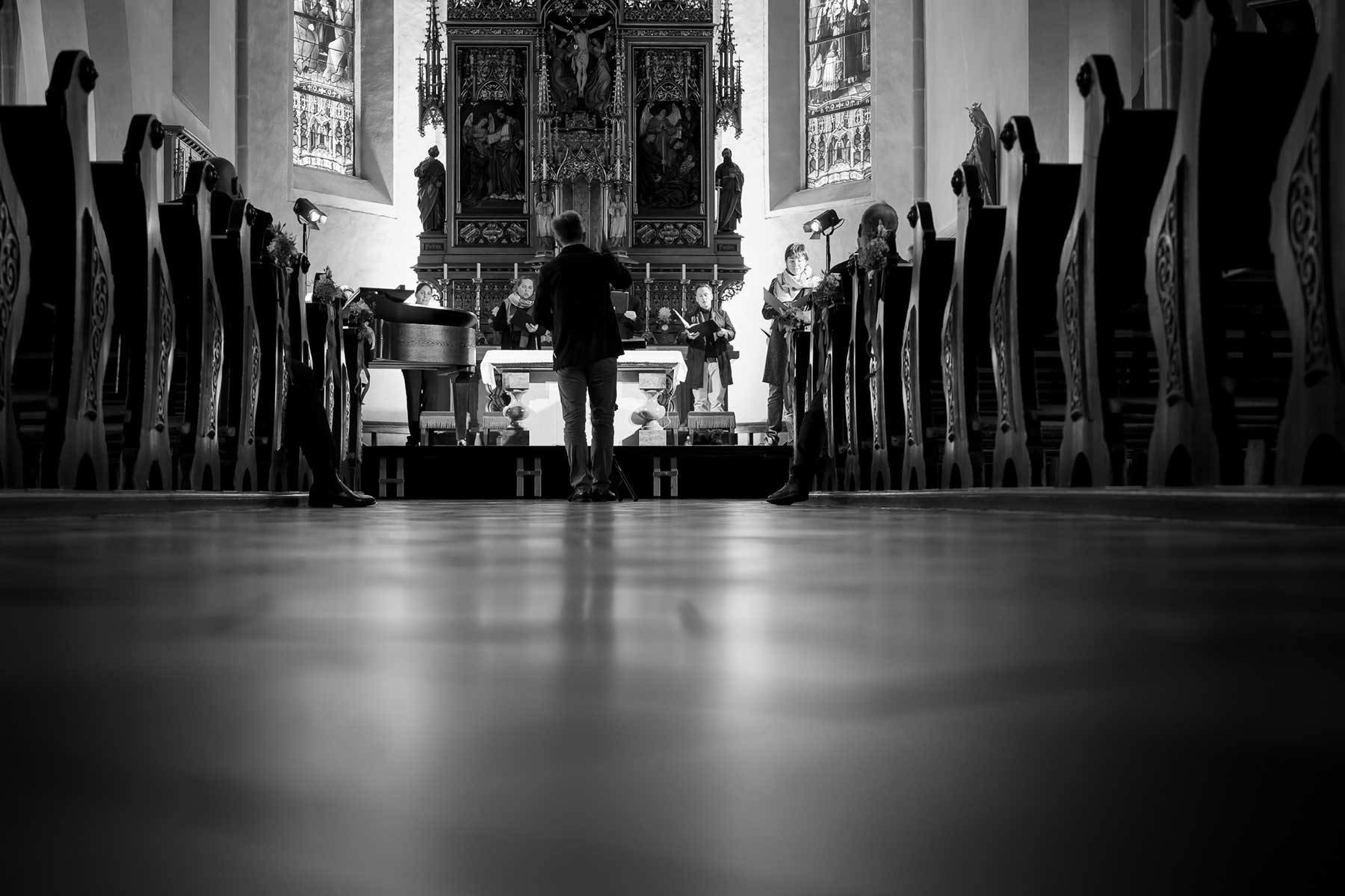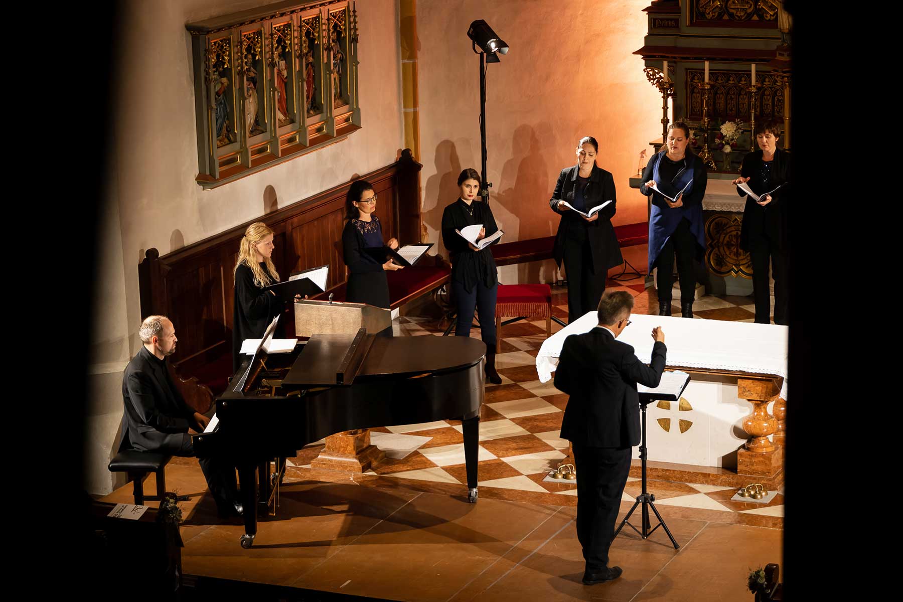 Die Stimmen dieses Chores, mal nur wenige, mal alle zusammen, von hoch bis tief, von laut bis leise, bildeten eine so außergewöhnliche Symbiose, dass einem die Musik von Schubert und Mahler wie aus einer anderen Welt erschien. Die berühmten Chorwerke Franz Schuberts – in einzigartiger Perfektion vorgetragen. Gustav Mahlers Rückert-Lieder in einer Bearbeitung für 12 Stimmen a capella geschrieben von Lukas Haselböck – zum Weinen schön. Die Klavierimprovisationen des ausgezeichneten Pianisten György Handl, die sich dazwischen einwebten – beeindruckend und bezaubernd. Die hochkonzentrierte Stille in der gut gefüllten Pfarrkirche während des gesamten Konzertes, der ausgelassene, tosende Applaus am Ende – Gänsehaut pur und der gebührende Dank an die Künstler*innen auf der Bühne.