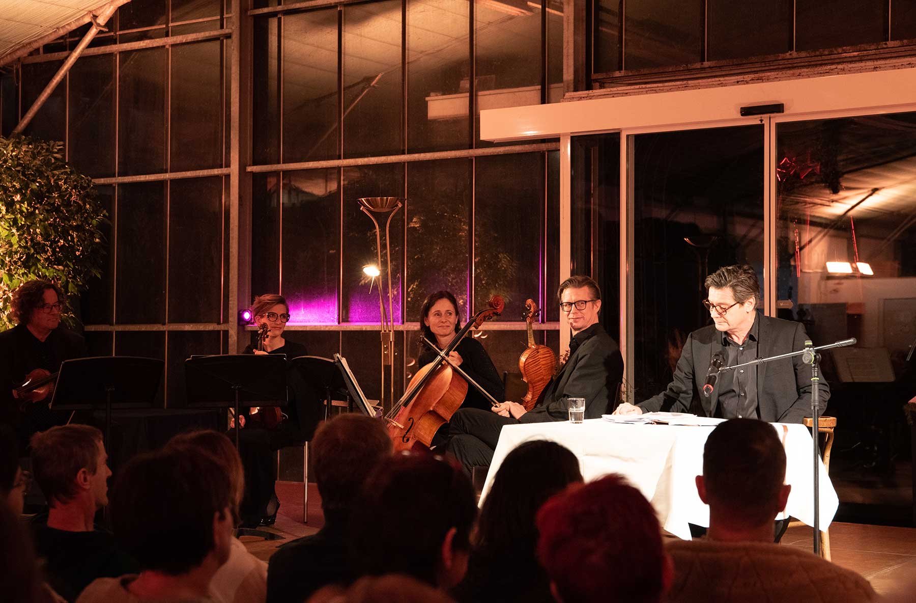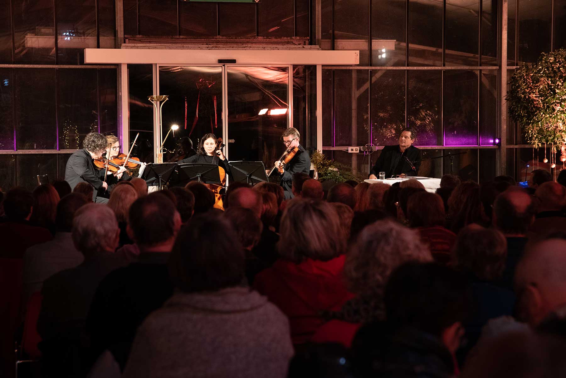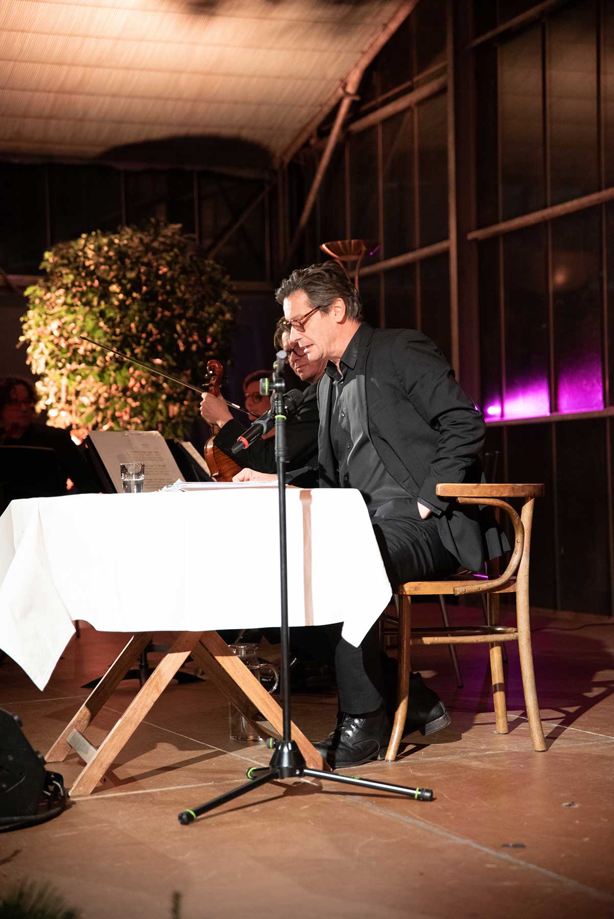Das ausverkaufte Palmenhaus hat gern gelernt, was ein Krippenrinderstreik ist, welche Vanillekipferltypologien es gibt und was die beliebtesten Weihnachtskrisen sind. Wussten Sie also, dass Ihre sommerlichen Downs nur die Pause zwischen Vor-, Haupt- und Nachweihnachtsdepressionen sind? Oder haben Sie sich je Gedanken gemacht, wie sich Ihr Charity-Gedanke auf Ihre Leber auswirkt? Wenn Sie all das nicht wissen, haben Sie einen der wunderbarsten Vor-Weihnachtsabende in Aschbach versäumt. Sie haben versäumt wie charmant und gekonnt einer der bekanntesten Schauspieler der deutsch-österreichischen Bühne auf Zwischenrufe reagiert. Und sind außerdem um wunderbar mitreißende Versionen von Weihnachts-Klassikern in kreativer Streichquartett-Manier umgefallen.