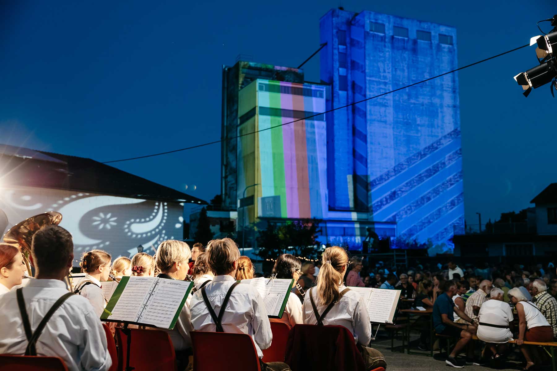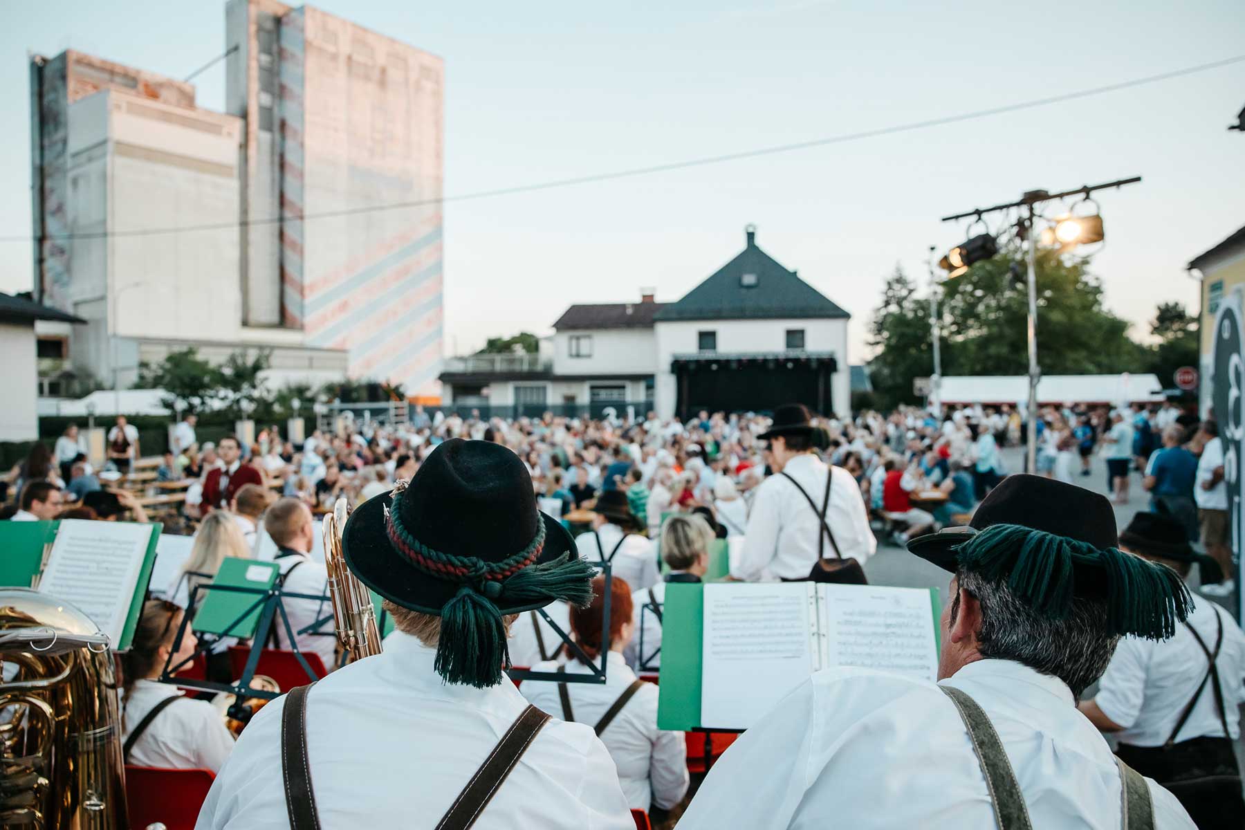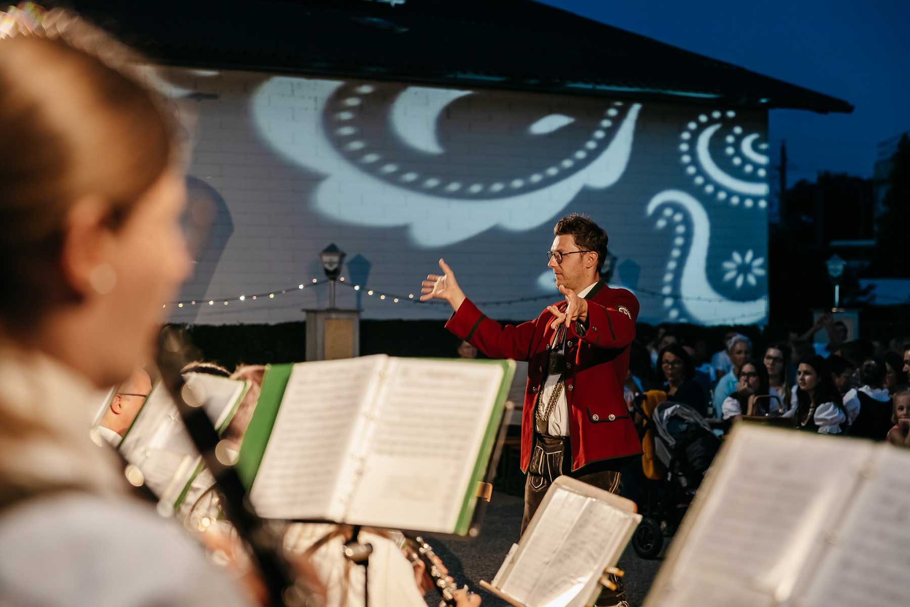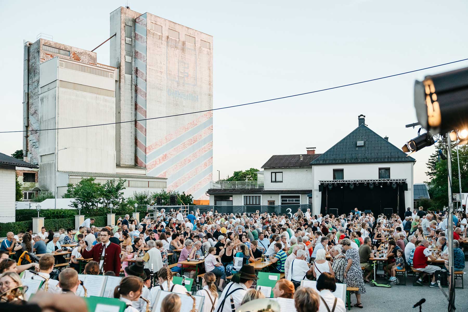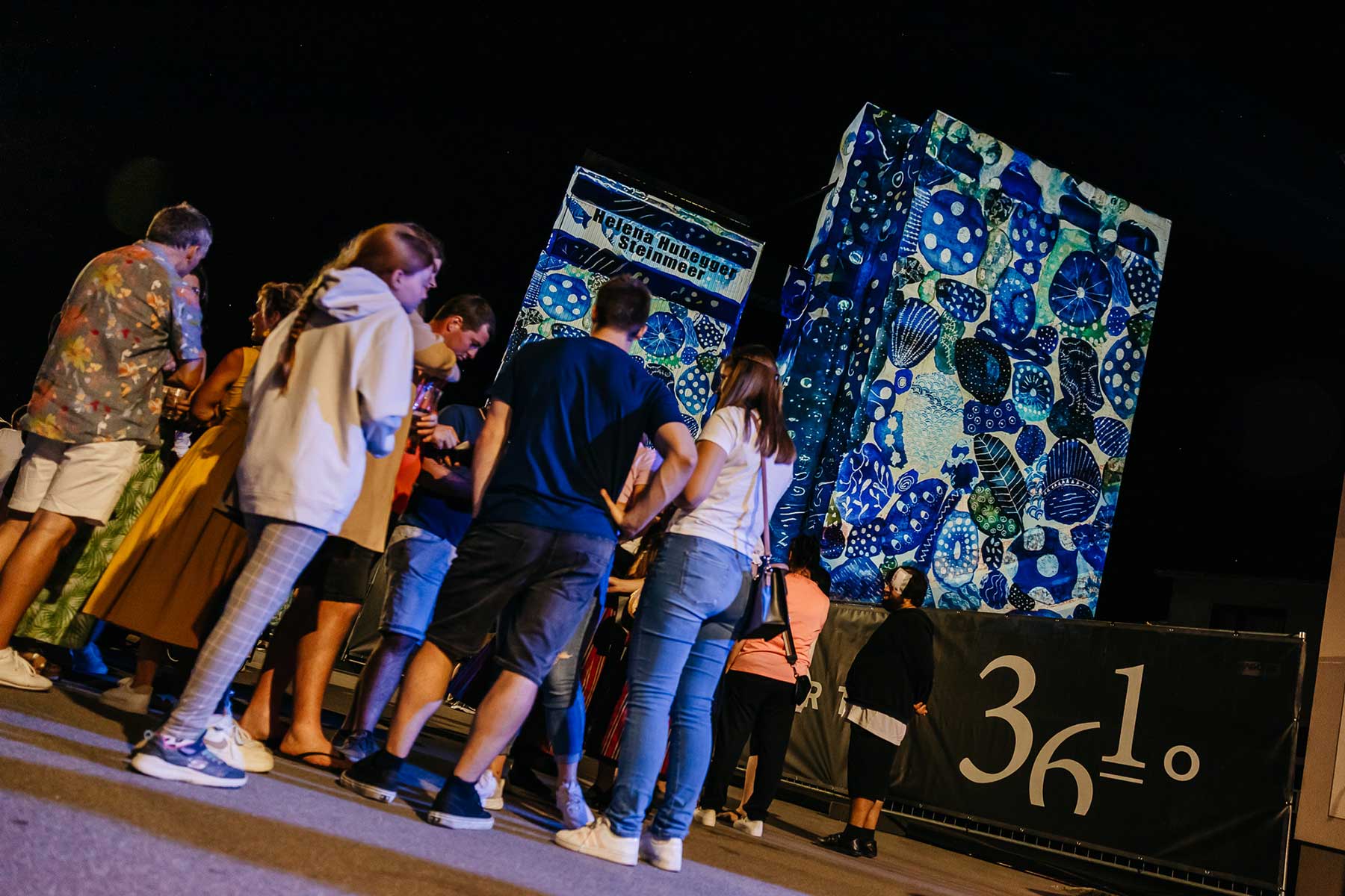 Großes Highlight an dem Abend außerdem: der Auftritt der Musikkapelle Aschbach mit der Uraufführung des „Ludwig“. Ein Kompositionsauftrag von 361°, ein Werk von Matthias Haslinger und Manfred Hirtenlehner. Ein Marsch als Geschenk von 361° an die Bewohner*innen Aschbachs – übergeben von uns stellvertretend an den Bürgermeister. Wir glauben, er war – wie über 1.000 (!) Besucher*innen an diesem Abend – ein bisschen gerührt. Beeindruckt. Inspiriert. Von dem Vibe, der dieses „Marktfest à la 361°“ umgab. Wir hatten es uns so gewünscht, genau so ging es in Erfüllung: es war ein besonderer Spirit in der Luft – generationenverbindend, in die Zukunft weisend, die Vergangenheit feiernd.
