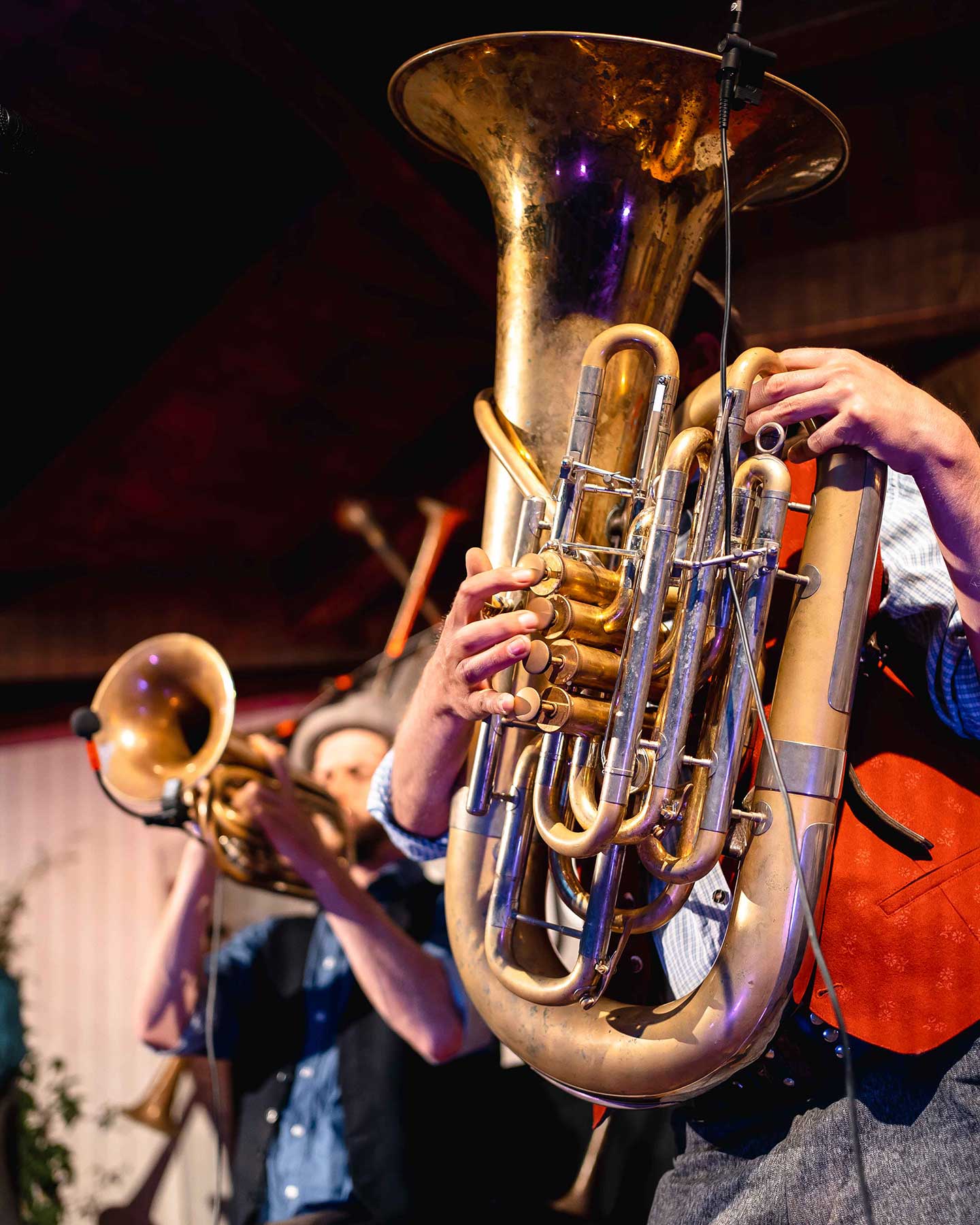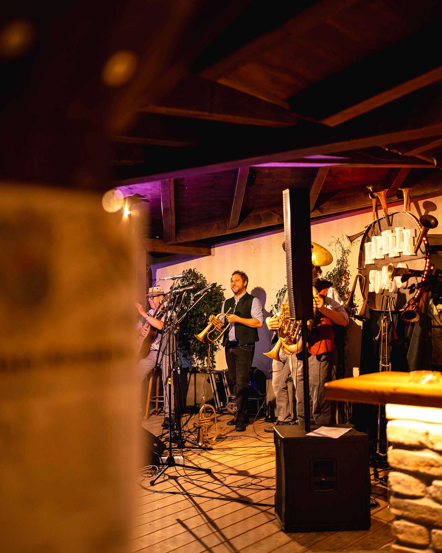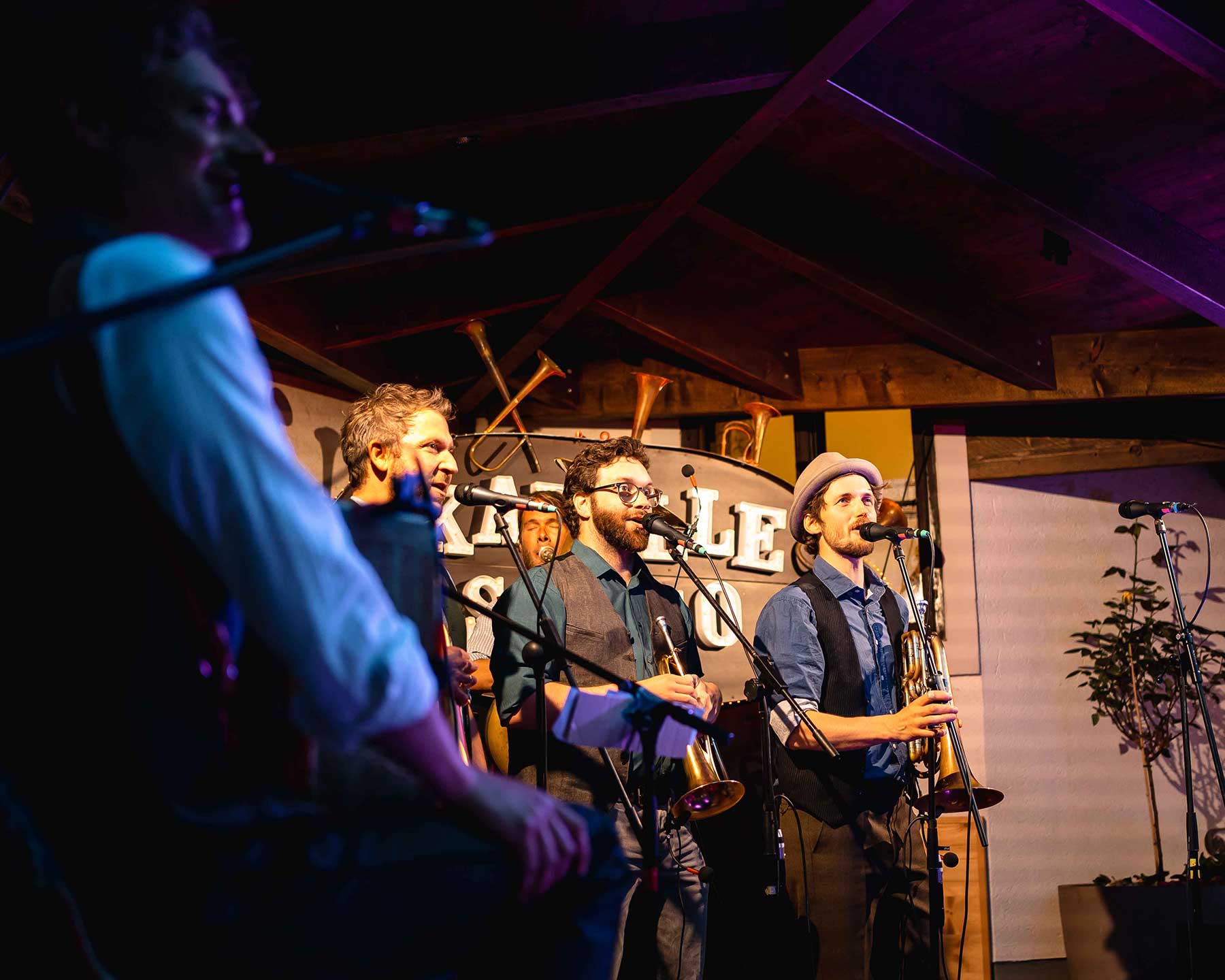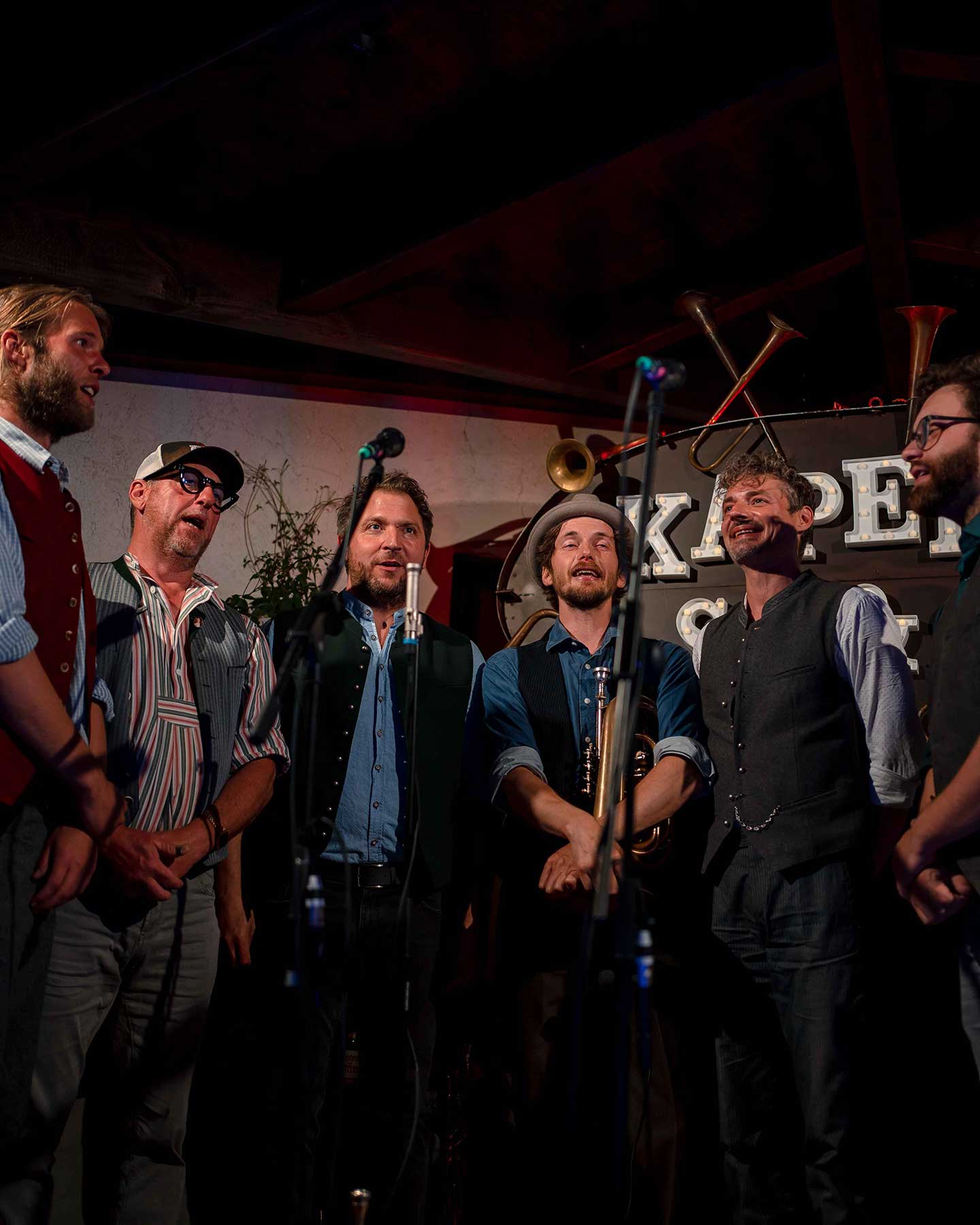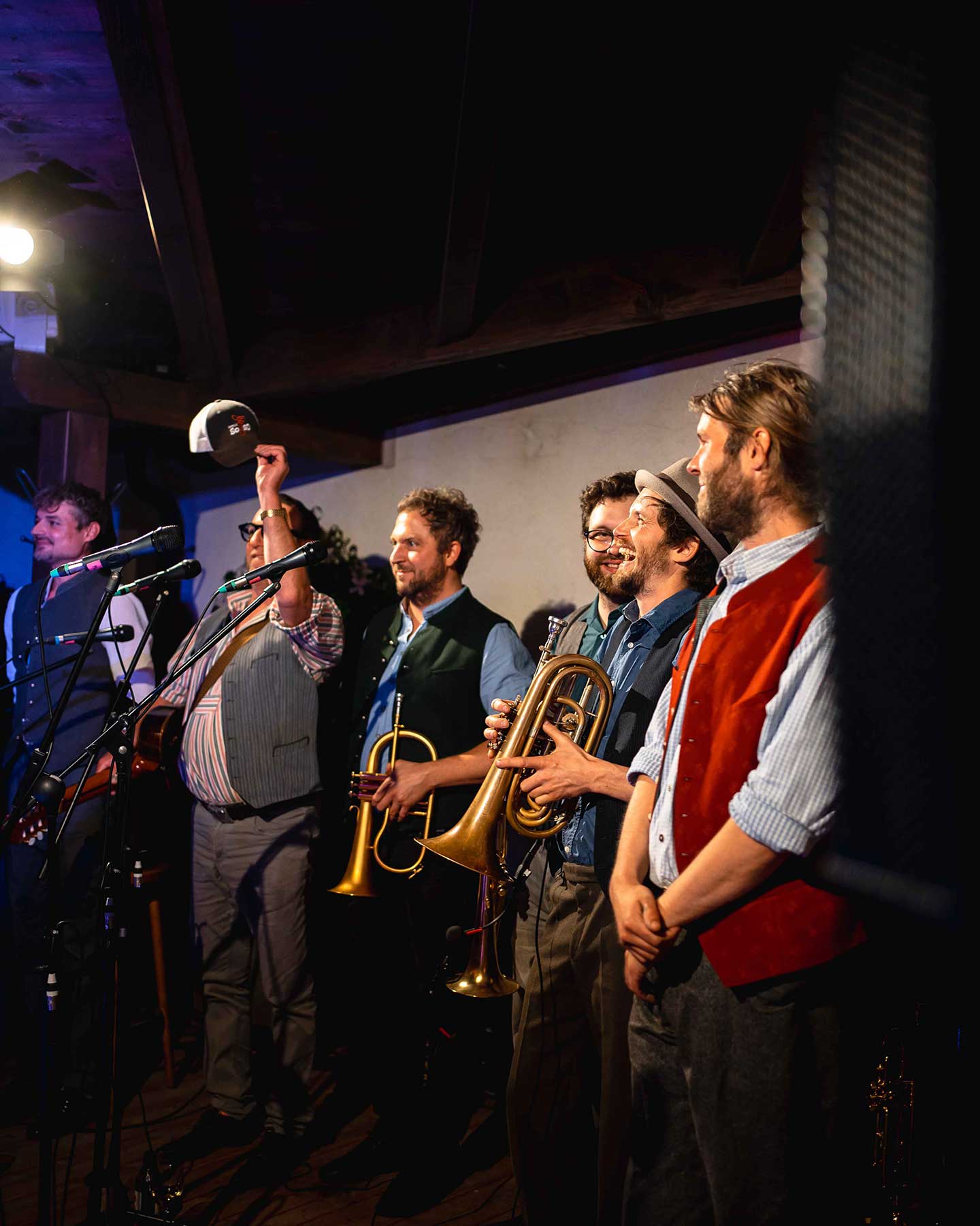 In diesem charmanten Ambiente begeisterten Hansi Auer (Ziach), Michi Graf (Gitarre), Joschi Öttl (Flügelhorn), Wasti Höglauer (Flügelhorn), Manu Haitzmann (Basstrompete) und Stefan Huber (Tuba) als Kapelle So & So. Die aus Bayern und dem Pinzgau angereiste Gruppe musizierte sich im ausverkauften Wirtshaus in die Herzen der Besucher*innen – selbst Fans aus Südtirol waren zu diesem Highlight angereist!