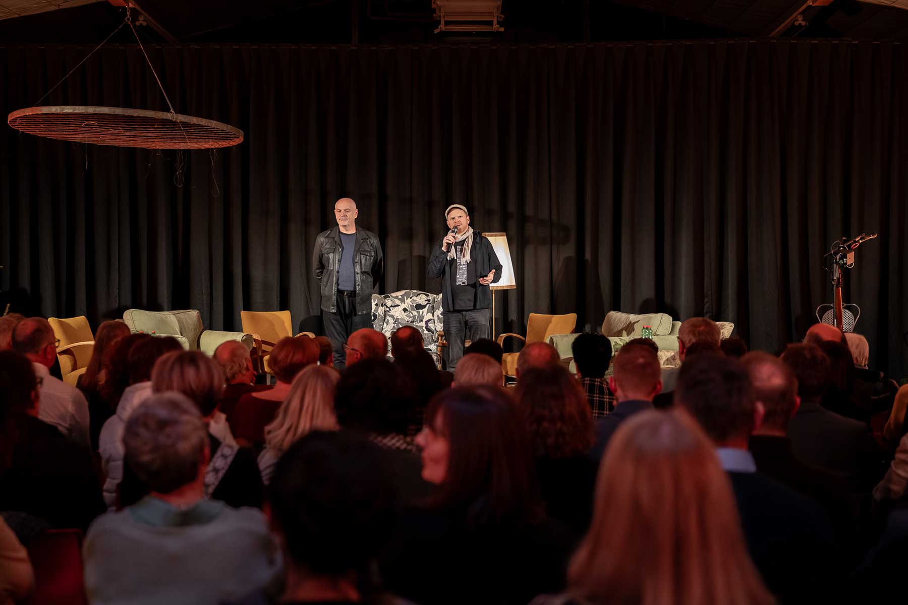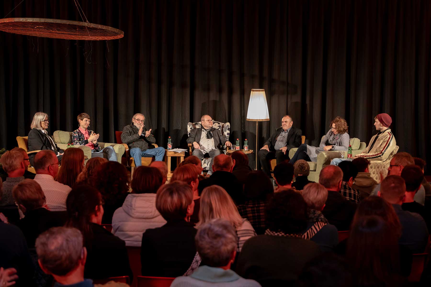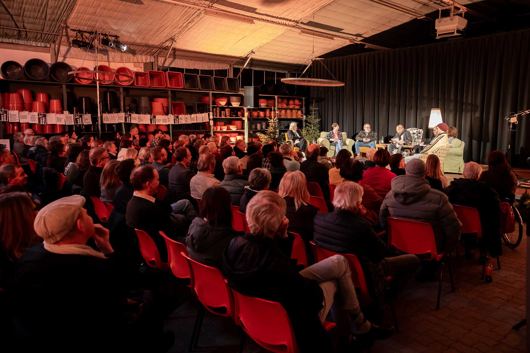 Zum Schmunzeln oder auch selbst Nachspüren luden die Erzählungen prägender Kindheits- und Jugenderinnerungen ein. Auch verlorene Sehnsuchtsplätze wurden aufgezeigt und der Umgang mit geschichtlichen Orten und architektonischen Besonderheiten wurde kritisch beleuchtet. Durch Wortspenden aus dem Publikum, aber auch angeregte Debatten im Anschluss an die Podiumsdiskussion, konnte man rasch merken, wie tiefgreifend all diese Themen im Leben der ansässigen oder auch nicht (mehr) ansässigen Personen verankert sind. Und wie schwierig es dennoch ist, öffentlich darüber zu reden. Gut 100 Gäste nahmen sich Zeit, um den eigenen Wurzeln, der eigenen Heimat und dem Landleben Raum zu geben und sich auf den eigenen und fremden Heimatbegriff einzulassen. Der Gitarrist Mario Malidus untermalte die Reflexionsmomente während der kurzen Pausen zwischen den Themenblöcken passend liebevoll.
