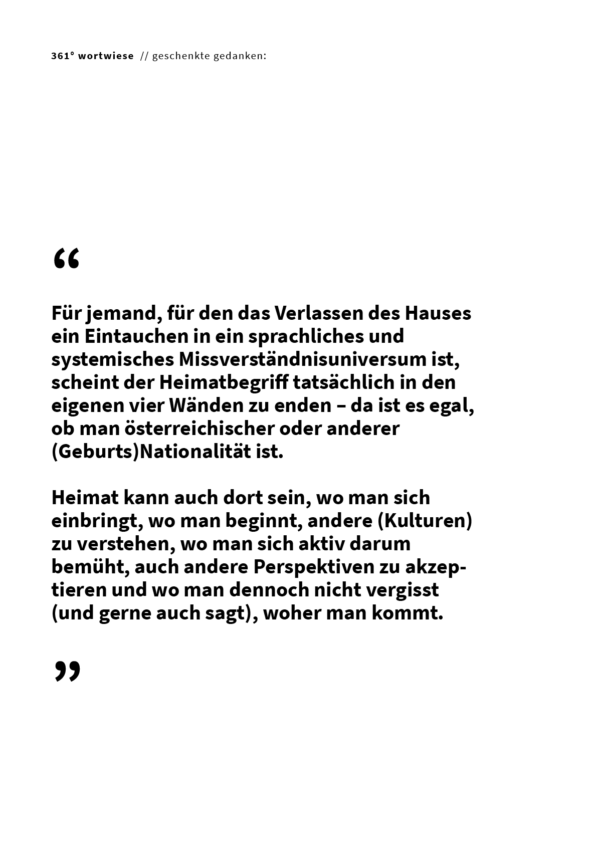 Während der Diskussion wurden auch einige der differenzierten Wort- und Gedankenspenden aufgegriffen, die während der letzten Wochen anonym auf unserer Webseite 361grad.at eingegangen sind. Danke herzlich dafür! Damit diese als Inspiration dienen und eine differenzierte Grundlage für die eventuelle weitere Auseinandersetzung mit dem Heimatbegriff auf persönlicher Ebene bilden können, streuen wir sie unter die Fotos von diesem eindrucksvollen Abend.