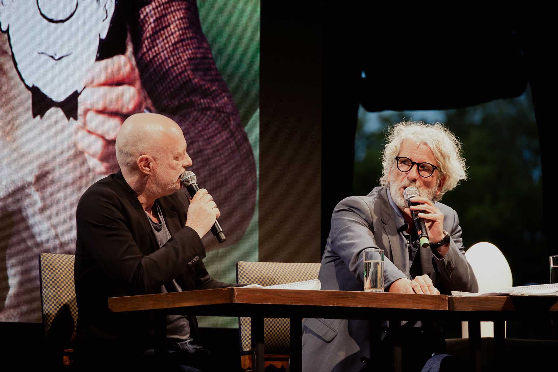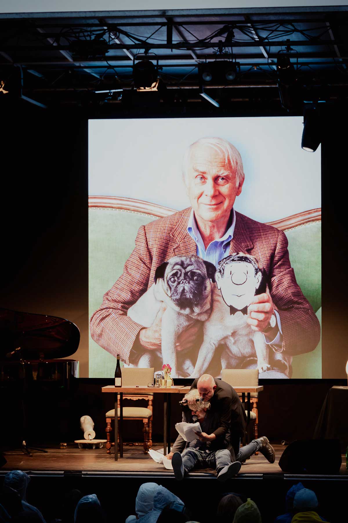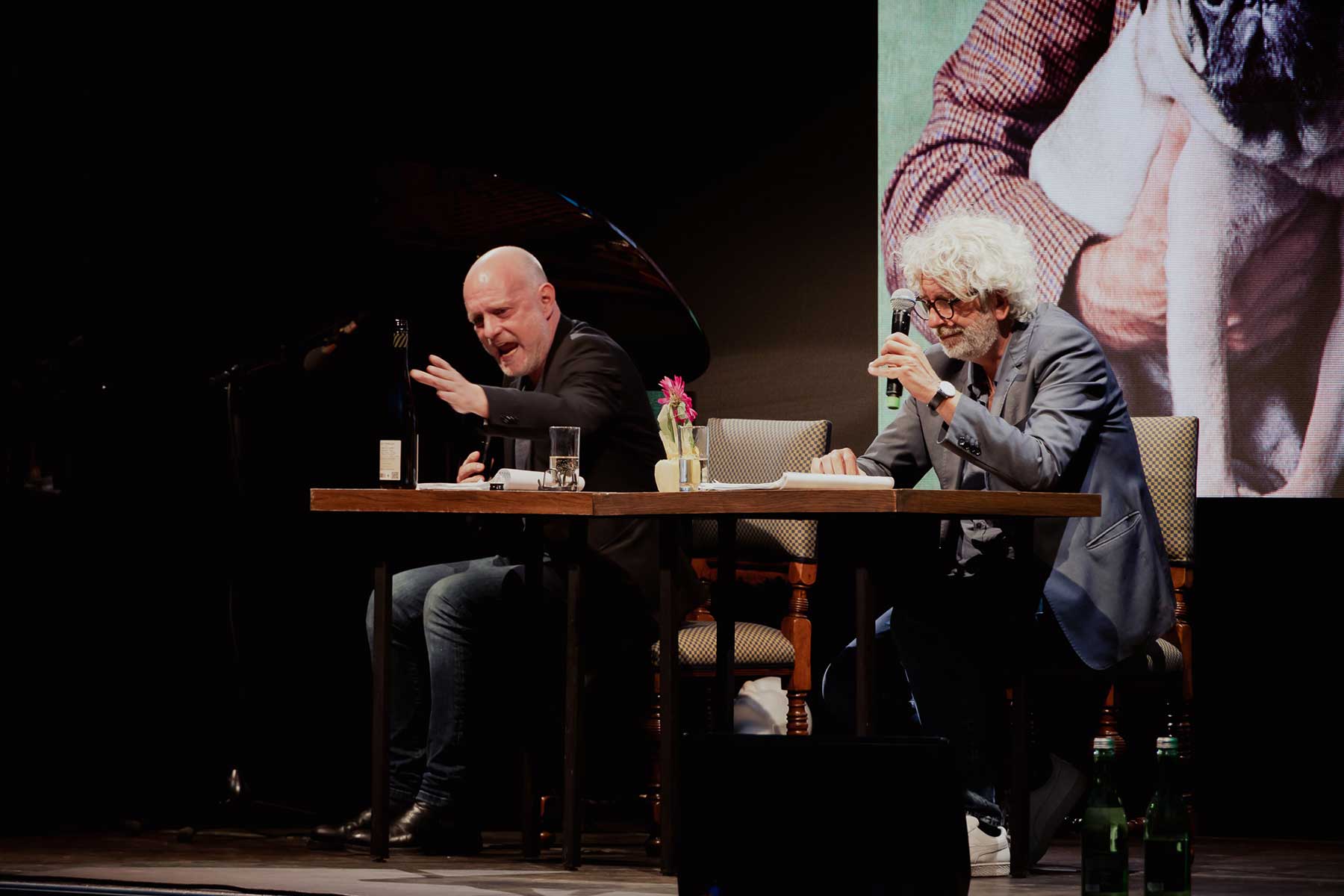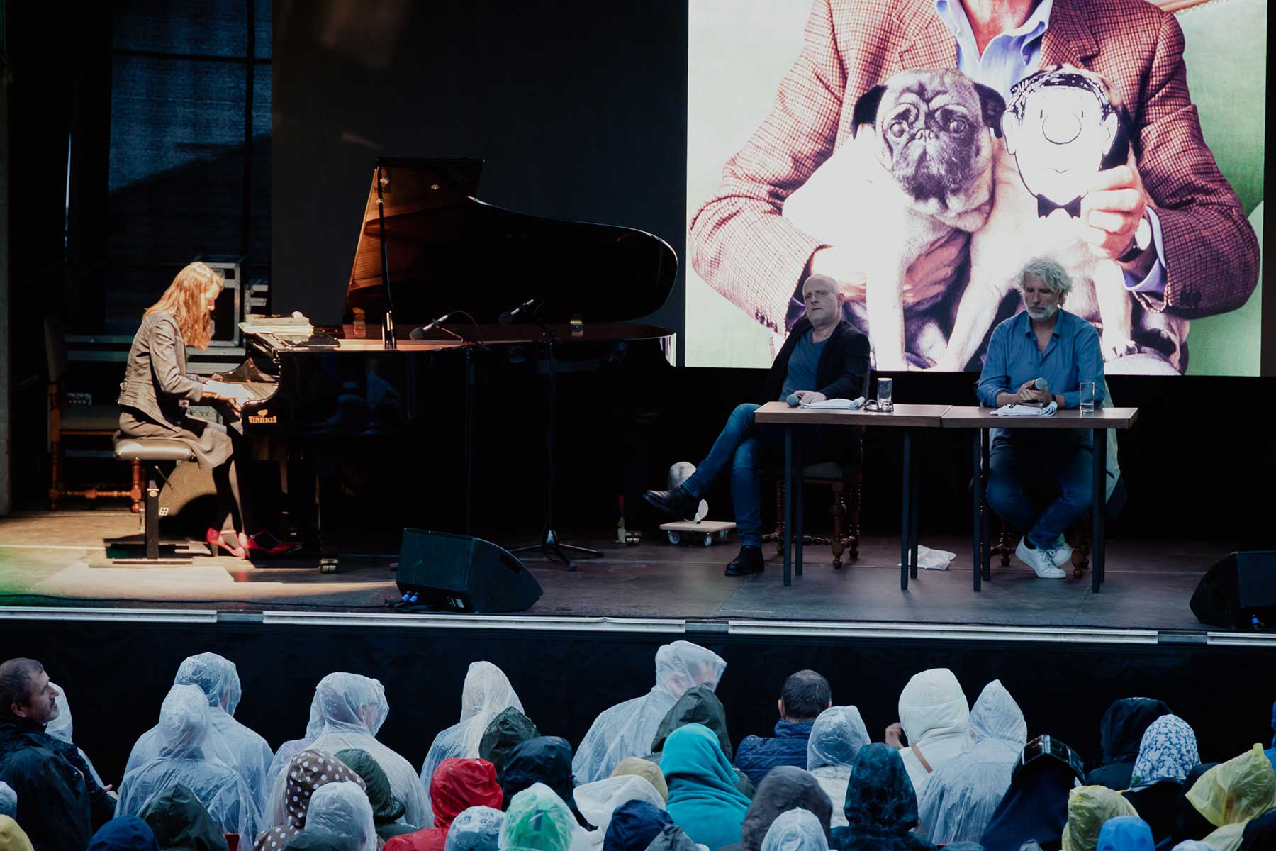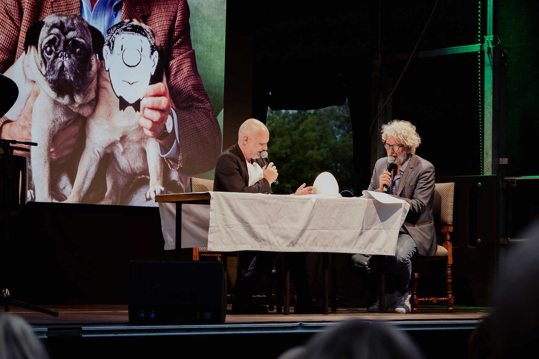 Und wie man sich täuschen kann! Christoph Grissemann und Dirk Stermann betraten am zweiten Abend unseres Open-Air-Wochenendes die Bühne und kurz darauf begann es doch tatsächlich zu regnen. Die beiden Kult-Satiriker fragten die Zuschauer kurz, ob es denn ok für sie wäre, aber es wäre einfach nicht unser großartiges 361° Publikum, würde sich davon jemand beirren lassen. Die Regenponchos waren schnell übergezogen, dem außerordentlichen Loriot-Programm war kein Abbruch getan.