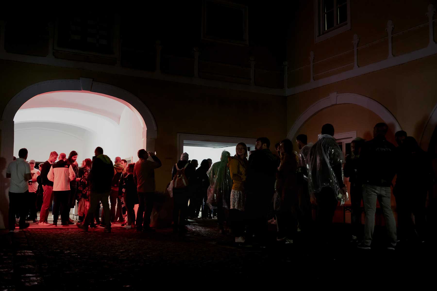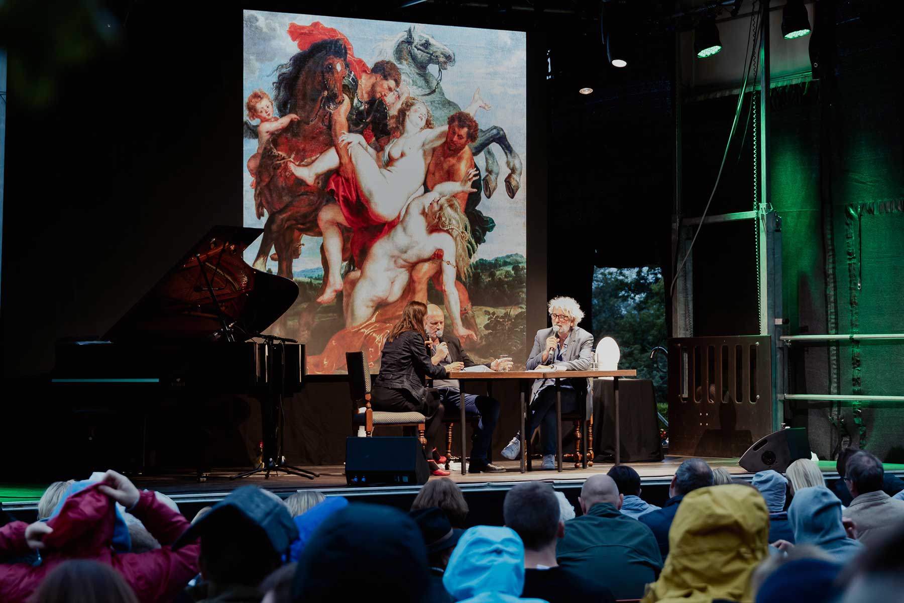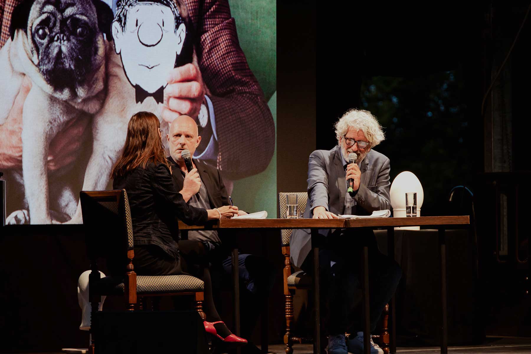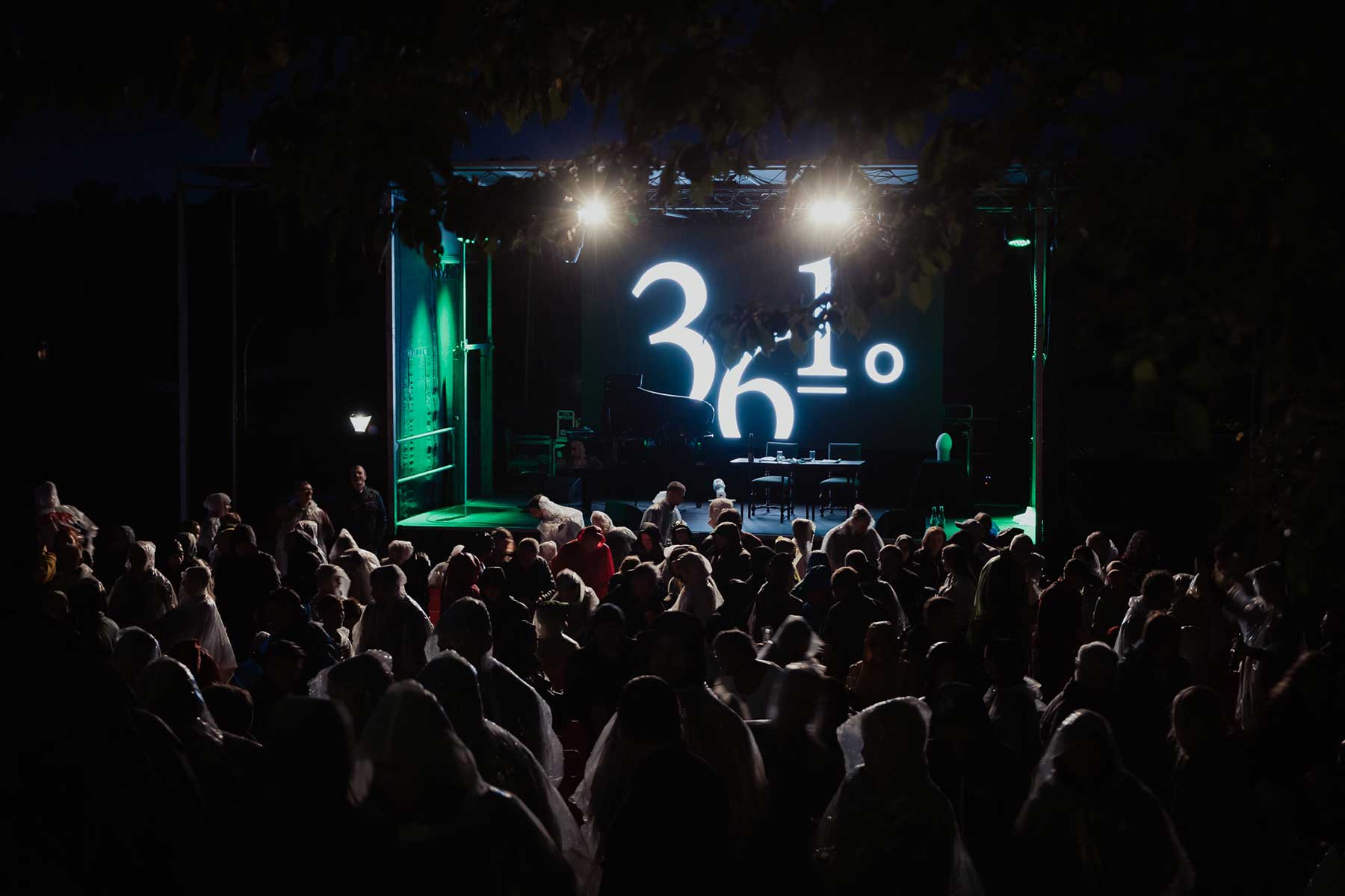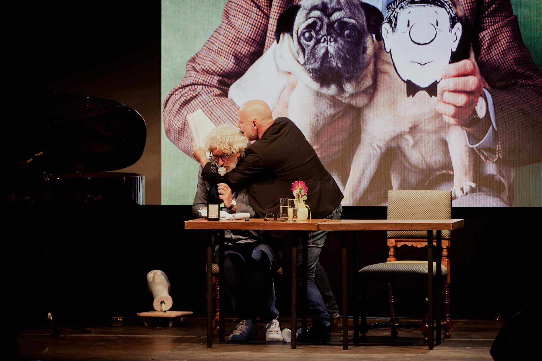 Und wie man sich täuschen kann! Christoph Grissemann und Dirk Stermann betraten am zweiten Abend unseres Open-Air-Wochenendes die Bühne und kurz darauf begann es doch tatsächlich zu regnen. Die beiden Kult-Satiriker fragten die Zuschauer kurz, ob es denn ok für sie wäre, aber es wäre einfach nicht unser großartiges 361° Publikum, würde sich davon jemand beirren lassen. Die Regenponchos waren schnell übergezogen, dem außerordentlichen Loriot-Programm war kein Abbruch getan.