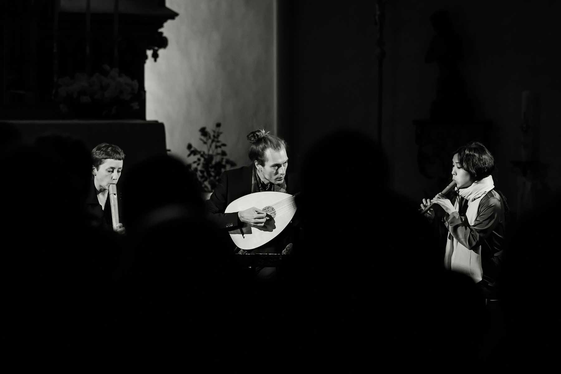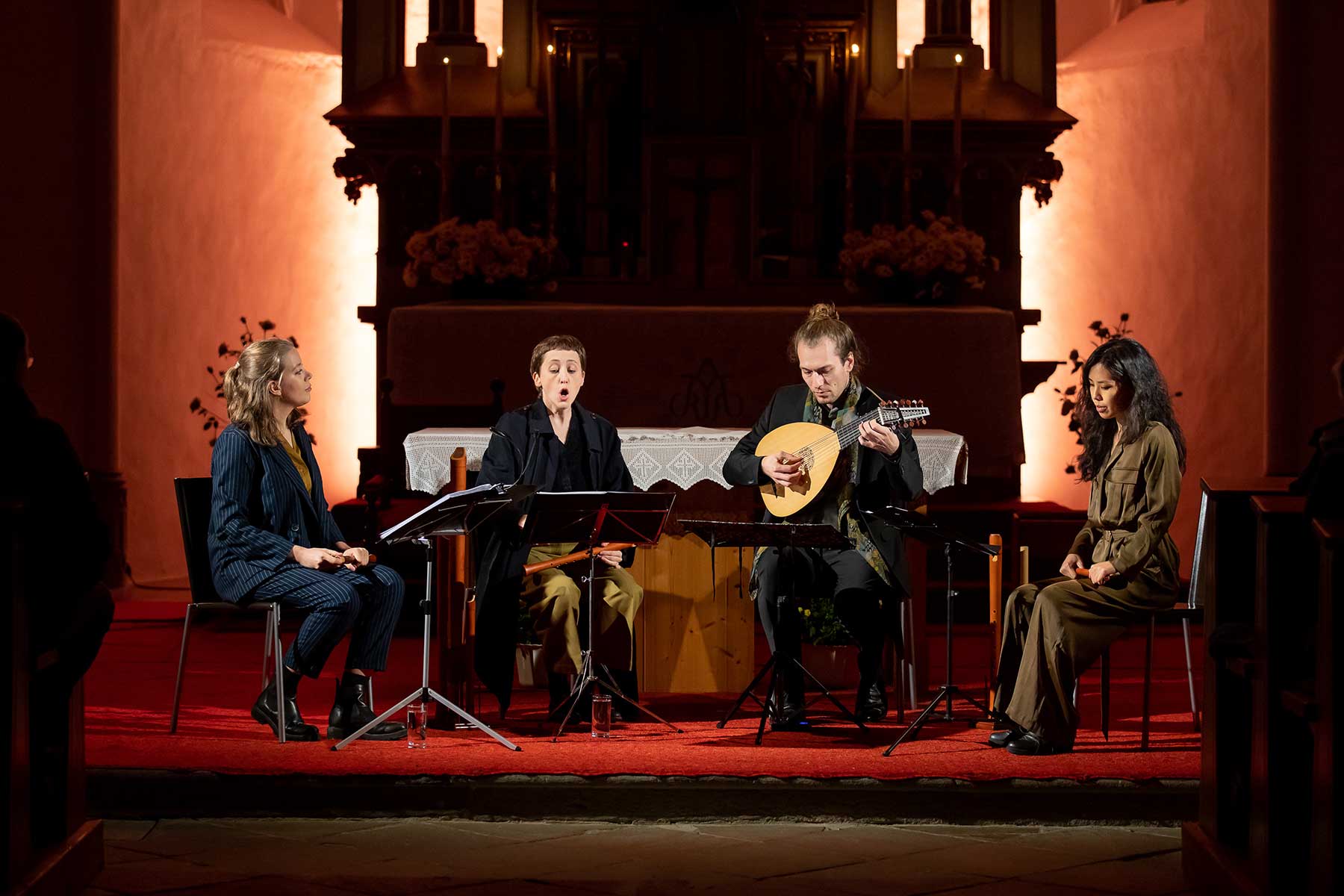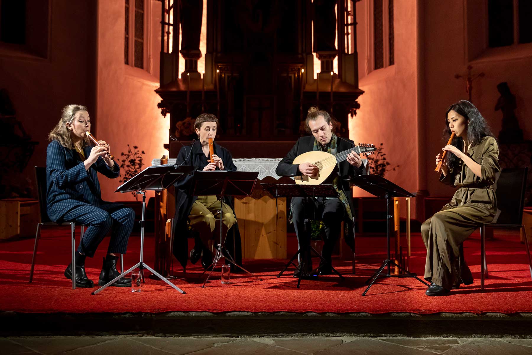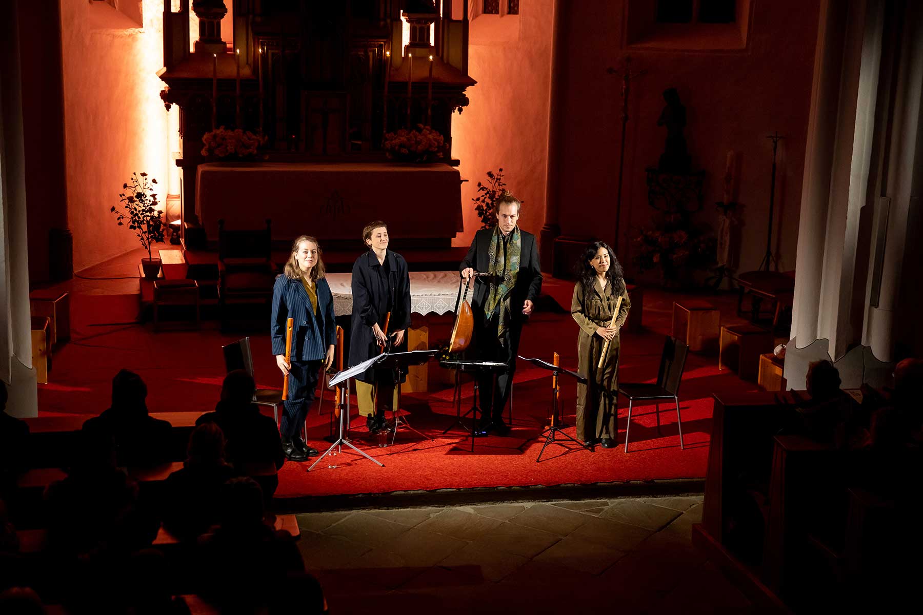 Christine Gnigler, Lorina Vallaster und Sheng-Fang Chiu (alle Blockflöte und Gesang) sowie David Bergmüller (Laute) ließen erahnen, wie „Popmusic“ vor gut 400 Jahren geklungen hat. Sie verzauberten mit ihrer Virtuosität das Publikum. Teilweise ertönte die Musik in so klarem Piano, dass man sich kaum zu atmen traute. Dennoch war in jedem Ton eine irrsinnige Kraft, die durch das Lautenspiel und den fantastischen Gesang noch einmal verstärkt wurde.