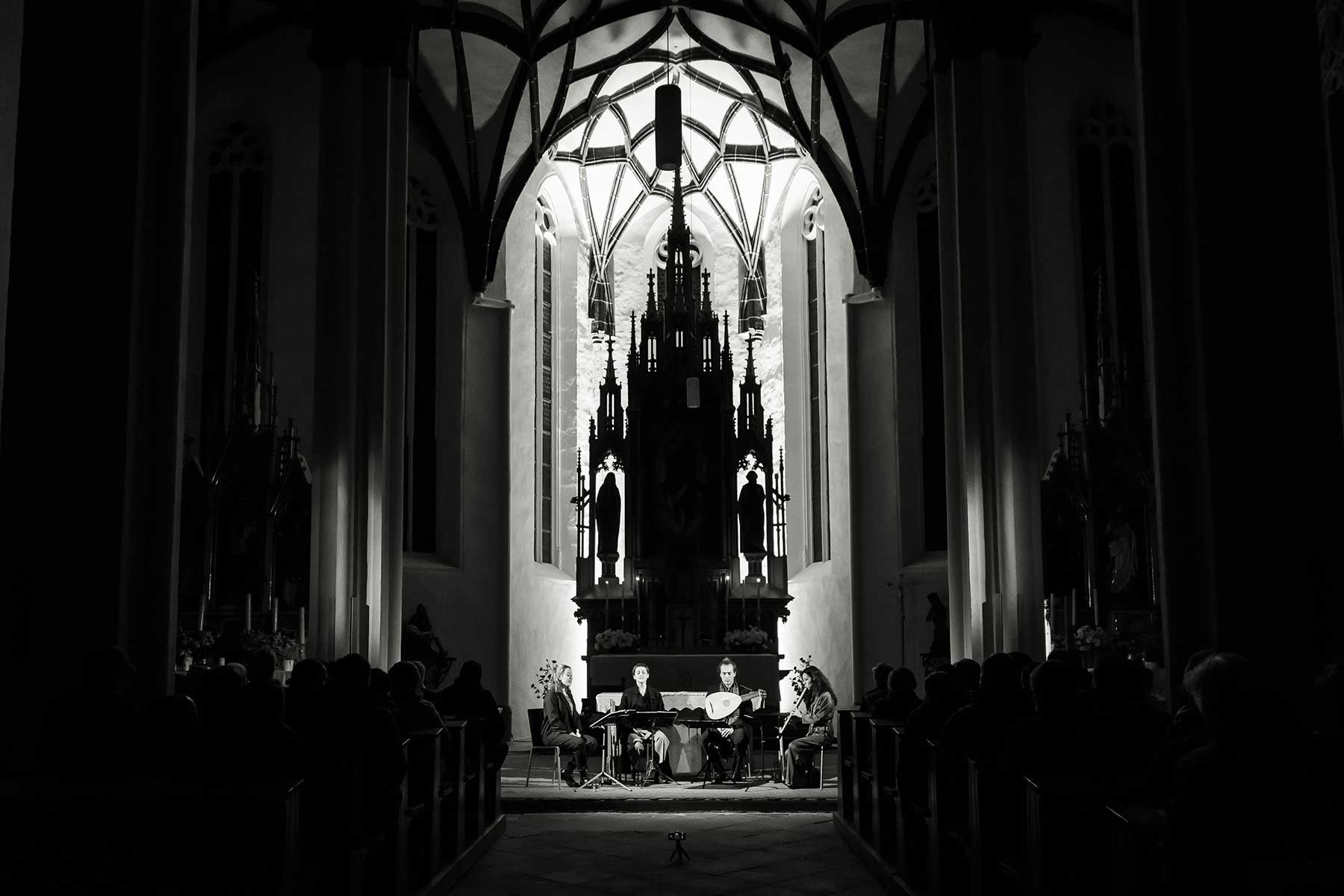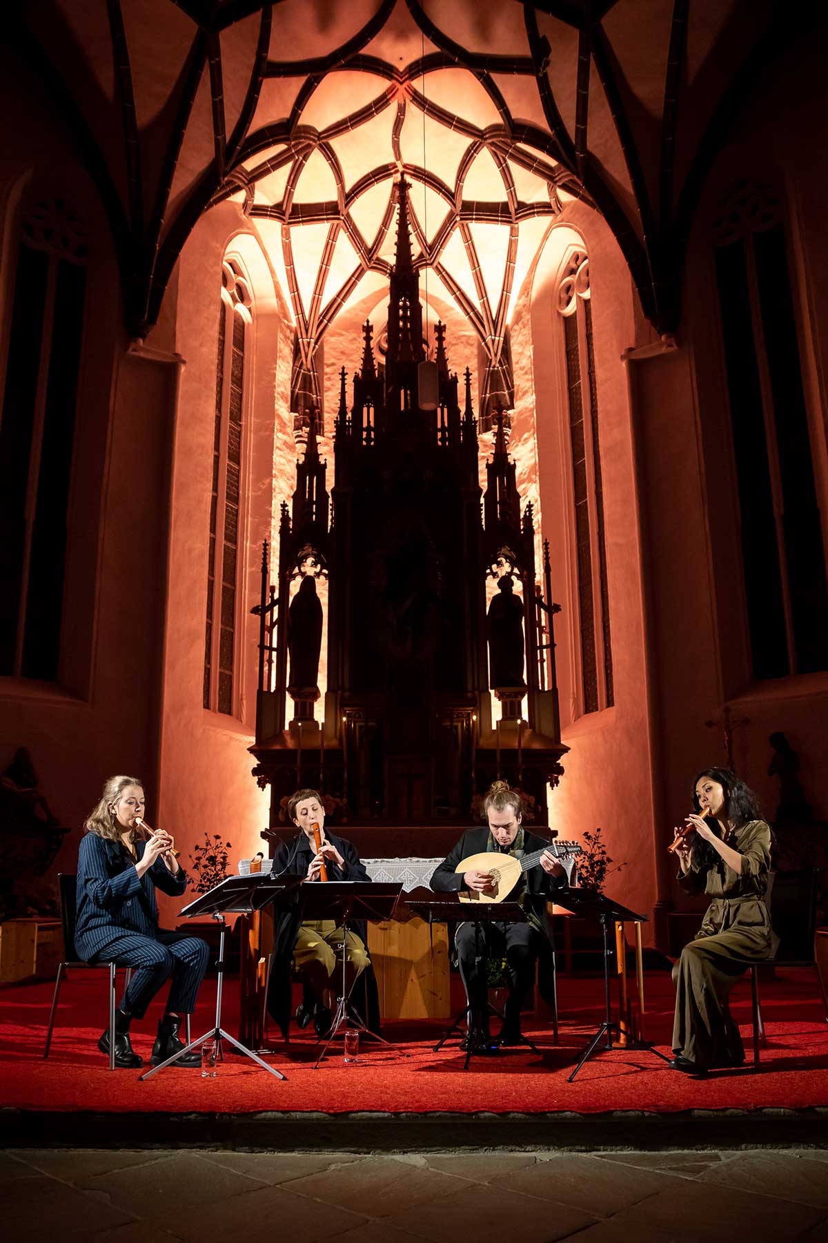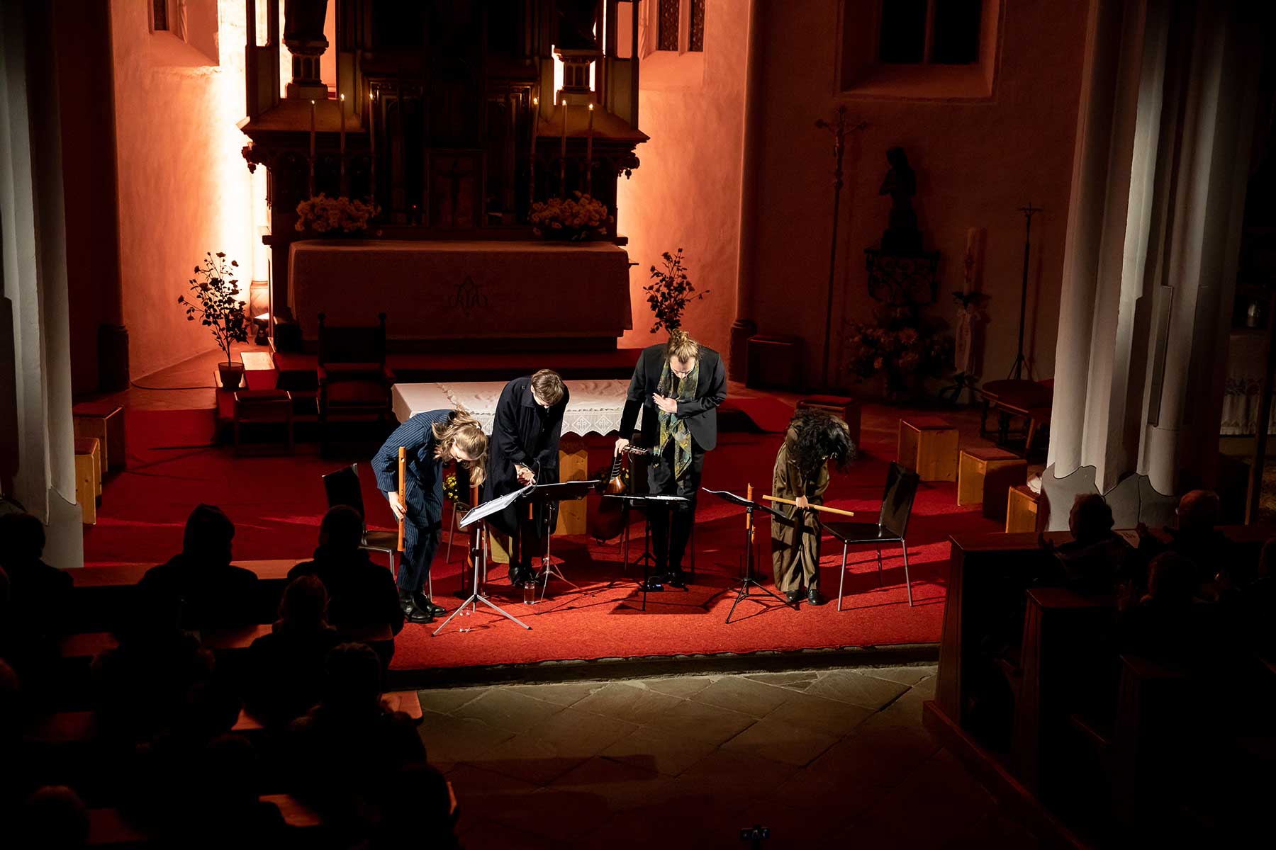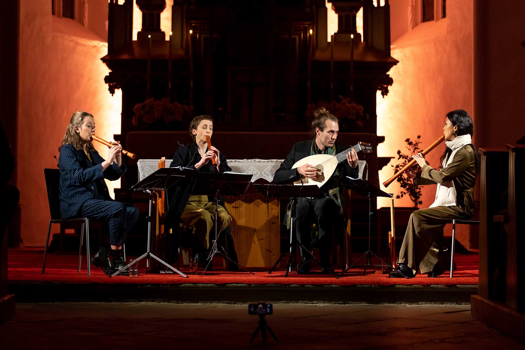 Christine Gnigler, Lorina Vallaster und Sheng-Fang Chiu (alle Blockflöte und Gesang) sowie David Bergmüller (Laute) ließen erahnen, wie „Popmusic“ vor gut 400 Jahren geklungen hat. Sie verzauberten mit ihrer Virtuosität das Publikum. Teilweise ertönte die Musik in so klarem Piano, dass man sich kaum zu atmen traute. Dennoch war in jedem Ton eine irrsinnige Kraft, die durch das Lautenspiel und den fantastischen Gesang noch einmal verstärkt wurde.