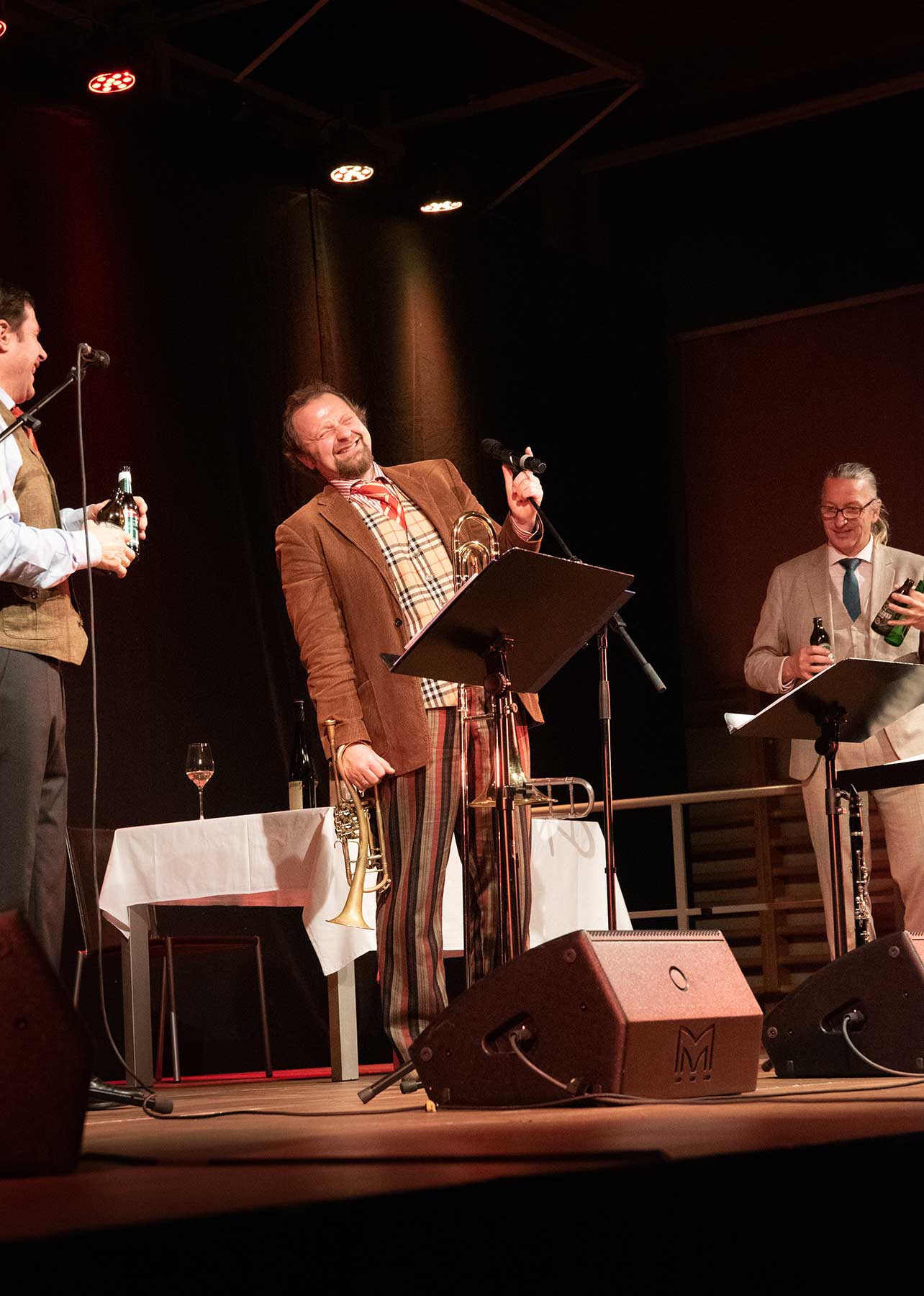 Als Thomas Gansch dann als Draufgabe noch unser neues Programm 2024 ankündigte, und spontan eine Stand-Up-Comedy auf der Bühne dazu entstand, war niemand mehr zu halten. Frenetischen Jubel, Begeisterungsstürme und dreimal Standing Ovations ernteten die Künstler aus dem tobenden Saal. Salzige Augenwinkel, soweit man sehen konnte. Ein gebührender Abschluss für dieses außergewöhnliche 361°-Kulturjahr. Ein Fest an Humor, Kreativität, Spontanität und unglaublichem musikalischen Können vor vollem Haus. So darf 2023 zu Ende gehen, und genau so darf sich 2024 fortsetzen. Wir freuen uns drauf!